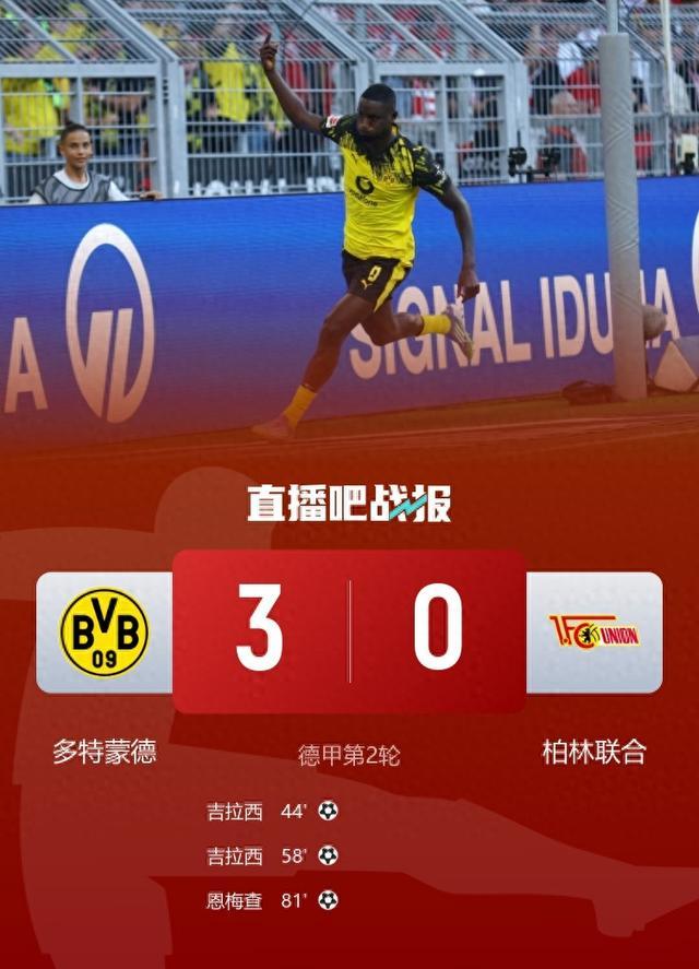 直播吧9月1日讯 北京时间8月31日23点30分,德甲第2轮,多特蒙德在主场伊杜纳信号公园球场迎战柏林联合。上半场,吉拉西单刀被扑后抢点打进一球。下半场,吉拉西完成双响,恩梅查替补建功。最终多特蒙德3-0击败柏林联合,取得赛季首胜。本场比赛过后,多特蒙德积4分,暂列联赛第三,柏林联合积3分,暂列第十。