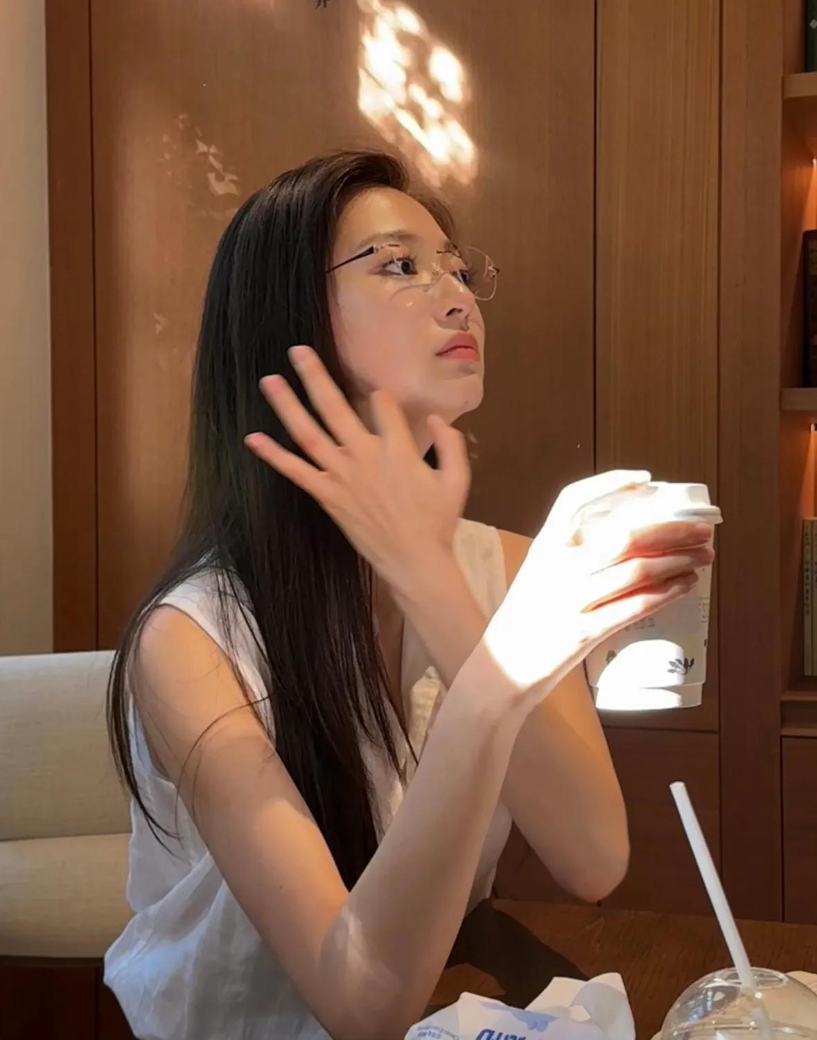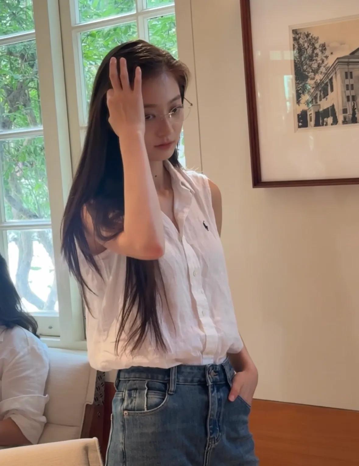 出镜装扮看似随意却暗藏心思,她身穿浅灰亚麻背心,搭配水洗蓝直筒牛仔裤,一身休闲打扮清新又显气质,整套造型的点睛之笔当属那副无框眼镜,与她标志性的黑长直发相映成趣,既保留了少女的纯净感,又平添了几分文雅书卷气,明明是最基础的日常单品,却让她穿出了干净利落的精英范儿,不少网友直呼这简直就是小说里的高干女主走进现实。