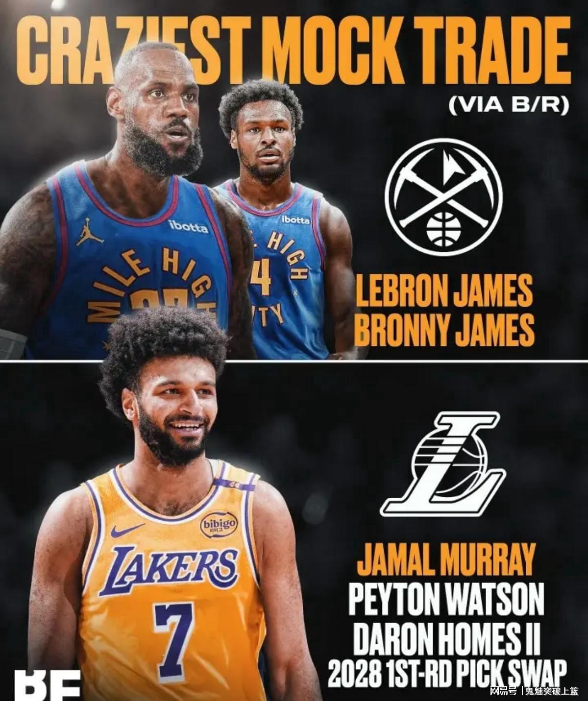 毫无疑问,詹姆斯若真要选择离开的话,届时他肯定会去争冠球队,因为他真的太想在退役前赢下自己生涯的第五个NBA总冠军。那么,若詹姆斯被交易的话,他会去到哪里呢?或许,去丹佛掘金联手约基奇冲冠会是个极其不错的选择。近日,美媒Basketball Forever更新社媒,晒出记者Dan Favale围绕詹姆斯加盟掘金所做出的交易模拟。具体交易方案为:湖人送出勒布朗詹姆斯+布朗尼詹姆斯,从掘金换回贾马尔穆雷+佩顿沃特森+达伦霍姆斯二世+2028年首轮互换权。