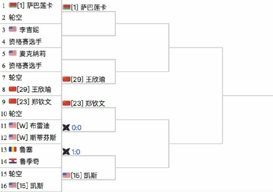 首轮比赛,郑钦文轮空,另一位中国金花王欣瑜同样首轮轮空。第二轮,郑钦文将将会对阵布雷迪和斯蒂芬斯之间的胜者。第三轮,郑钦文则将有望对阵凯斯。若能顺利闯入8强,郑钦文就会在1/4决赛中对阵大魔王萨巴伦卡。